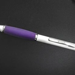 This pen has a pearl white barrel, a purple rubber grip and chrome accents